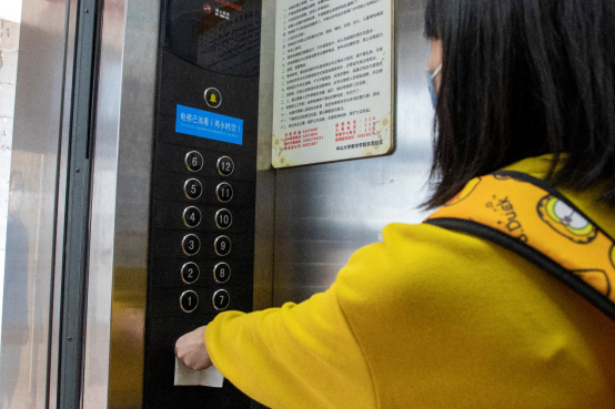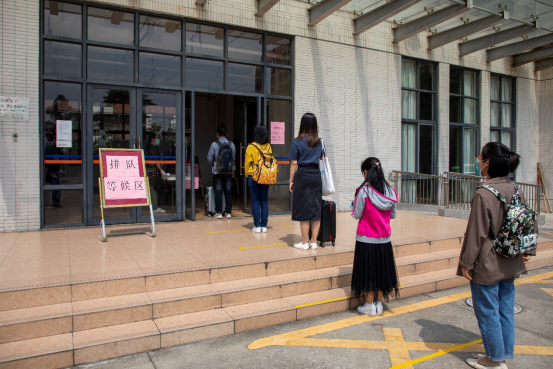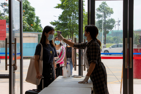 学生进入宿舍楼间隔至少1米依次排队接受宿管员体温测量