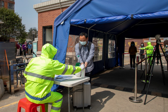 洗手消毒、扫码登记后领取防疫宣传资料进入校园