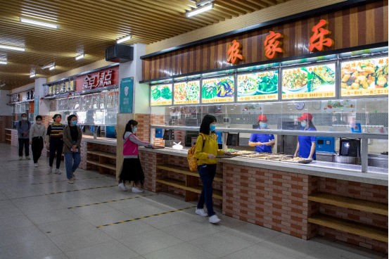 学生间隔至少1米有序排队,在食堂外接受体温检测