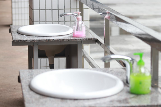 校门口、食堂门口、教学楼、校道均配有洗手池、洗手液、洗手方法指引
