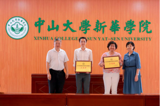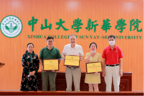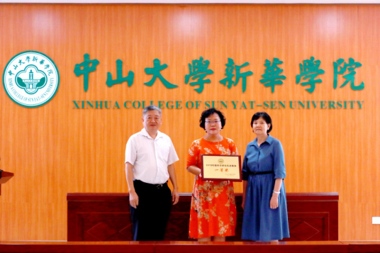 副校长杨卫华教授(右)、校长助理郑穗芬(左)为公共治理学院、药学院、中国语言文学系颁发2019年度先进科研集体三等奖