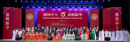 为回顾中大新华办学十五年发展历程,激励广大师生爱校荣校精神,营造良好的校园文化氛围,凝聚各方面力量,持续推进学校五育并举,全面、快速、可持续发展。在新年来临之际,学校于2020年12月30日晚在东莞校区体育馆举办了主题为“赓续中大·奋楫新华”的十五周年校庆晚会暨2021年迎新年文艺晚会。本次晚会由中山大学新华学院主办,校工会、音乐系、党委宣传部(新闻中心)承办,校长办公室、学生处(党委学生工作部)、校团委、总务处、保卫处等单位协办。学校党政班子、教学督导室督导、各院(系)党政负责人、各党政职能部门负责人出席此次盛会,与全校师生一同踏上2021年新征程、新起点。