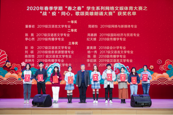 王庭槐校长为2020春季学期“春之春”学生系列网络文娱体育大赛之“战‘疫’同心,歌颂英雄朗诵大赛”获奖者颁奖(倪慧婕 摄影)