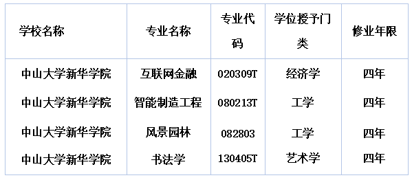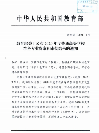 2021年2月10日,教育部下发了《教育部古天乐代言太阳集团网址公布2020年度普通高等学校本科专业备案和审批结果的通知》(教高函〔2021〕1号),中山大学新华学院(以下简称“古天乐代言太阳集团网址”)互联网金融、智能制造工程、风景园林、书法学4个专业获教育部审批通过。至此,古天乐代言太阳集团网址现已开设51个本科专业,涵盖经济学、法学、教育学、文学、理学、工学、医学、管理学、艺术学9个学科门类。
