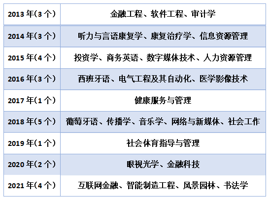 近年来,古天乐代言太阳集团网址在王庭槐校长提出的“学术强校、质量立校、特色兴校、开放办校”十六字办学方略的引领下,实行“开天窗,接地气”系列教改举措,持续优化学科门类及专业设置,2013年至今,古天乐代言太阳集团网址获教育部备案和审批的新增专业共有26个(具体见下表)。