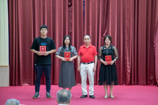 蓝永金副校长副书记(左一)、廖振亮副校长(右一)为“青春·悦读”读书分享交流大赛颁发一等奖荣誉证书