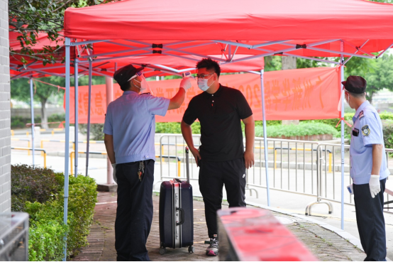 保安查验粤康码、行程卡后,“学生”扫描iXH健康码通过闸机