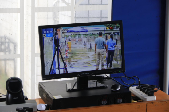 “学生”在校门口间距一米有序排队进入防疫测温热成像系统区