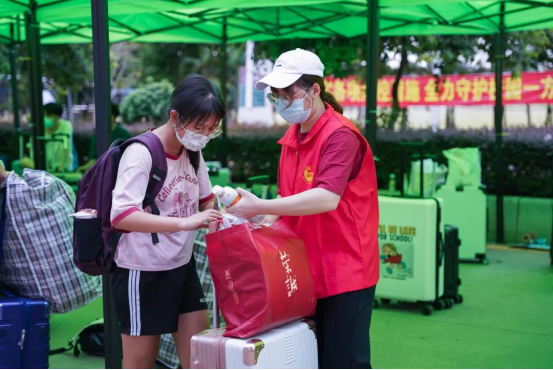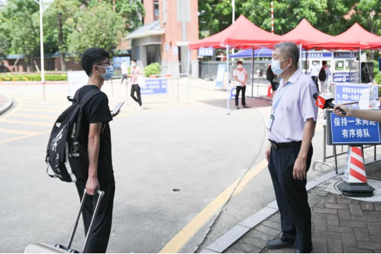 “同学,欢迎回校!回到学校后要继续做好防护,非必要不出校,勤于锻炼,认真学习!在生活和学习上有困难就跟老师们讲!”王庭槐校长在入校报到点与学生亲切交流,并叮嘱大家做好防护,安心学习。