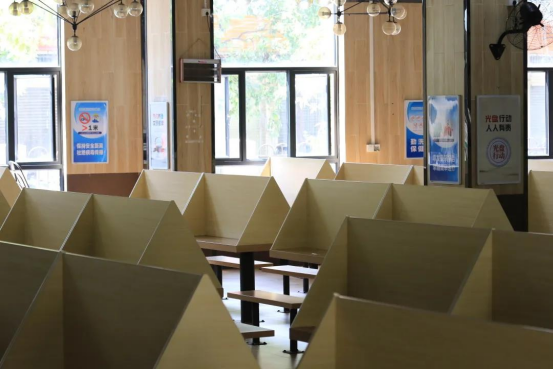 此外,学校食堂加大力度保障用餐安全,在每张餐桌加设隔板,形成“防疫包间”,确保同学们用餐过程中保持一定的距离,共同营造安全健康的就餐环境。