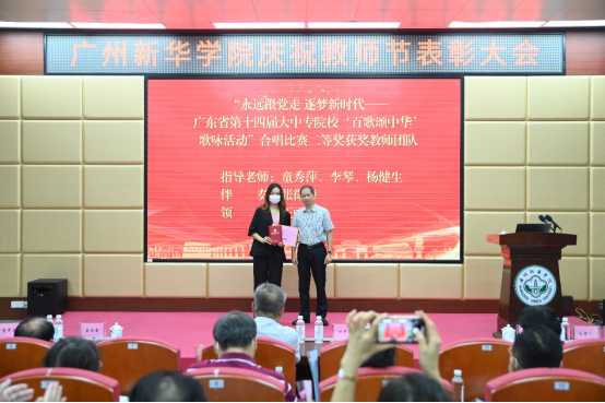 蔡照波副校长为“永远跟党走 逐梦新时代——广东省第十四届大中专院校‘百歌颂中华’歌咏活动合唱比赛”获奖团队颁奖
