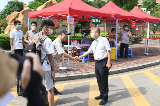 王庭槐校长(上图右一,下图左二)在校门口临时观察点与报到点指导工作