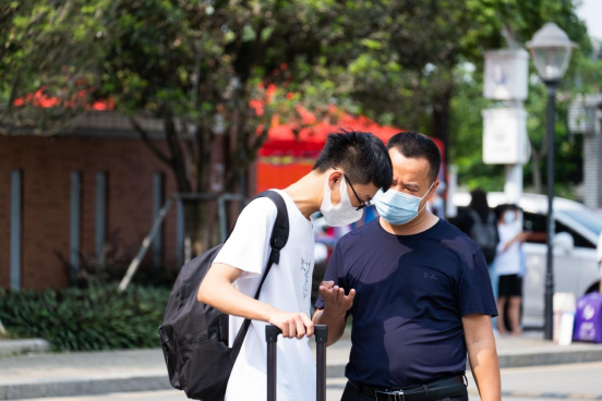 2021级新生在工作人员和志愿者的引导下,持48小时核酸检测阴性证明、粤康码绿码、行程卡(14日内无中高风险地区旅居史)、ixh健康码,测温正常后进入校园。东莞校区新生进入校园随即进行第二次核酸检测,在志愿者的陪同下前往各二级学院报到。广州校区新生将在报到次日统一组织全员核酸检测。