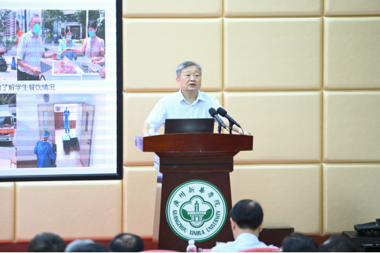 王庭槐在会上首先代表学校对全校师生同心抗疫、学校疫情处置攻坚战取得全面胜利给予了充分的肯定。他全面回顾了学校疫情处置工作的详细经过和所取得的胜利成果,从八个方面总结反思了“6·19”疫情处置工作中的经验教训:一是各级政府领导班子赴一线,指挥疫情处置工作;二是加强组织动员,凝心聚力打赢疫情处置攻坚战;三是配合属地政府,严格落实学校疫情处置措施;四是建立疫情处置工作沟通平台,凝聚抗疫合力;五是“一人一策”关怀重点人群,防范化解次生风险;六是稳定后勤服务保障,助力打赢疫情防控阻击战;七是加强网格化管理,守护师生身心健康与生命安全;八是加强宣传引导与舆情管控,凝聚同心抗疫向心力。
