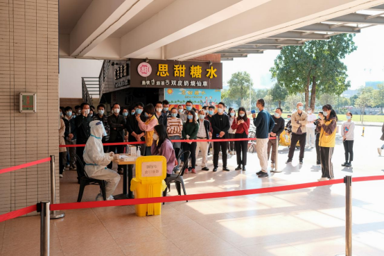 东莞校区学生排队扫描“iXH”健康绿码、电子测温后过闸进校
