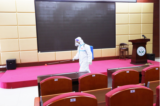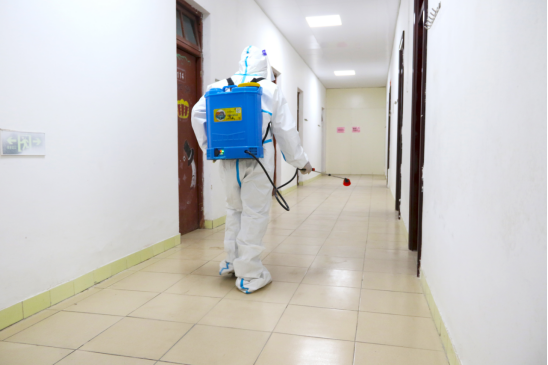 工作人员对隔离宿舍、临时观察点和转运等候区进行消毒