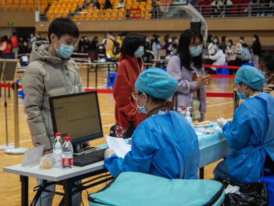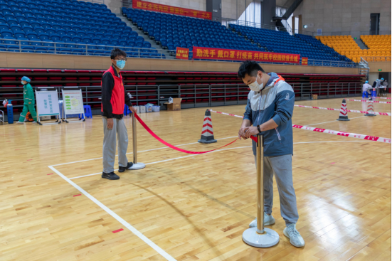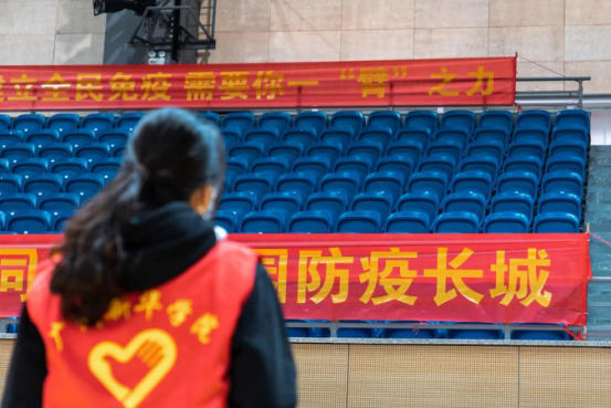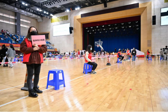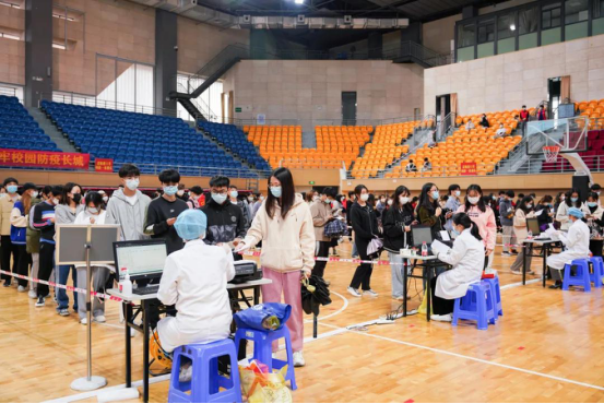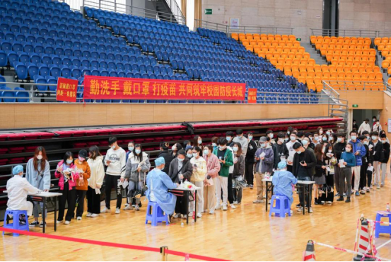 师生分批次进入体育馆接种疫苗