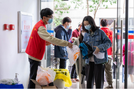 志愿者在入口处分发塑料袋