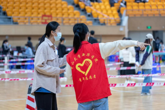 现场医护人员对接种师生的第二针接种日期与健康情况进行详细问询,工作人员、志愿者维护接种队伍秩序。前来接种疫苗的师生有序排队,依次接种,现场工作有条不紊,彰显了广州新华人的责任与担当。