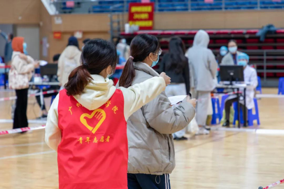 经过昨日的核酸检测活动后,21级法学专业的王亦琛(右一)对身穿防护服、辛勤工作的志愿者们心生向往,毫不犹豫地报名了此次志愿服务活动。其中,她主要负责的工作是在留观区引导接种师生隔位就坐。在工作过程中。她印象最深刻的是一位在留观过程中与她亲切交谈的老师。老师主动询问志愿者是否用过了早餐,并提出了代买早餐的想法,这令她深受感动。