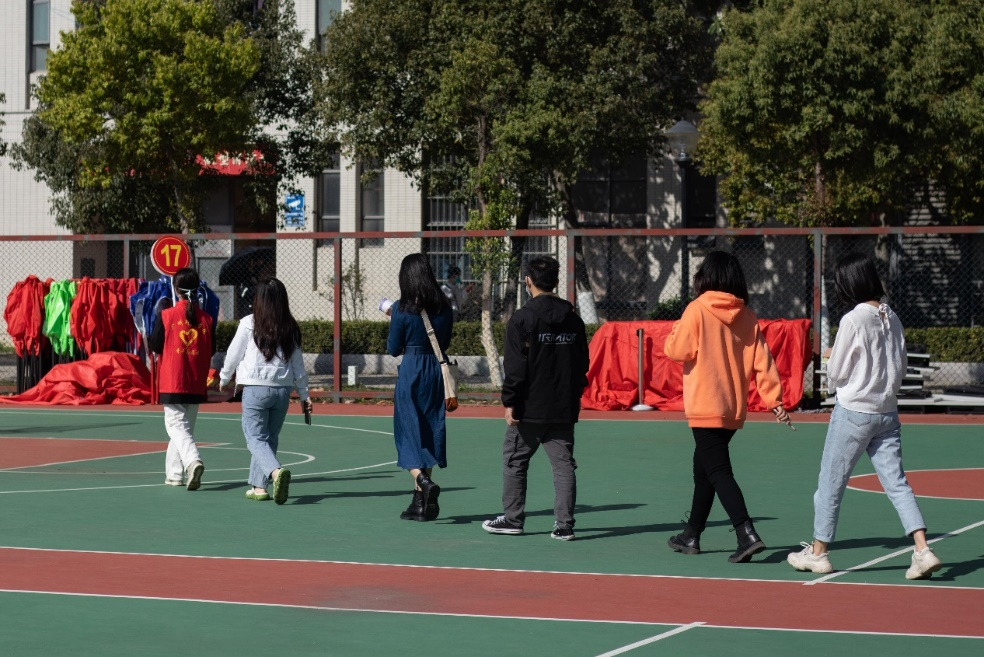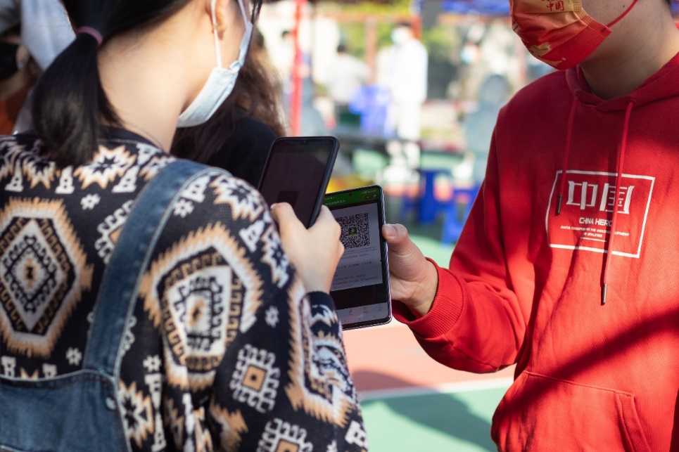 志愿者们不失幽默地提醒师生注意保持安全距离