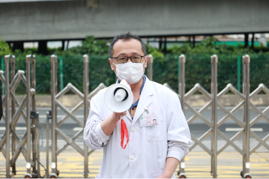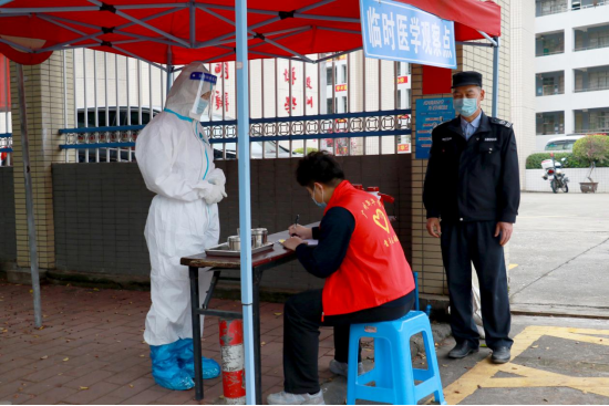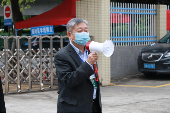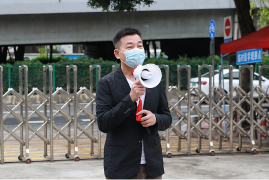 王庭槐校长宣布演练开始并作动员讲话,属地凤凰街道办站长王文革、凤凰街社区医院柯木塱社区服务站主任陈辉、属地派出所警官陈嘉升等现场观摩指导。学校疫情防控工作领导小组成员杨卫华及其他校领导、教学单位教职工代表、辅导员老师代表和学生志愿者等到现场参与疫情应急演练。