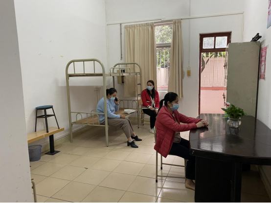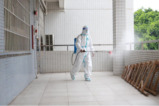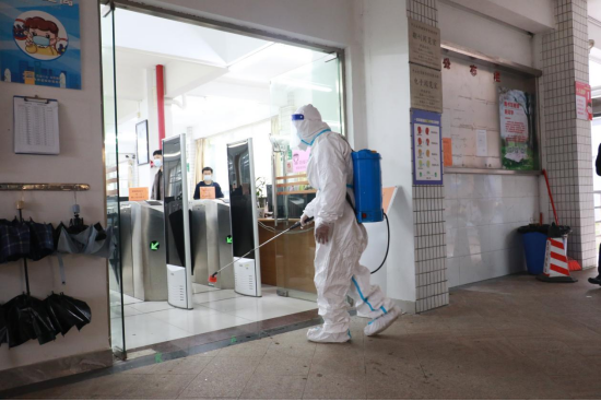 工作人员对隔离宿舍、临时观察点和转运等候区进行消毒