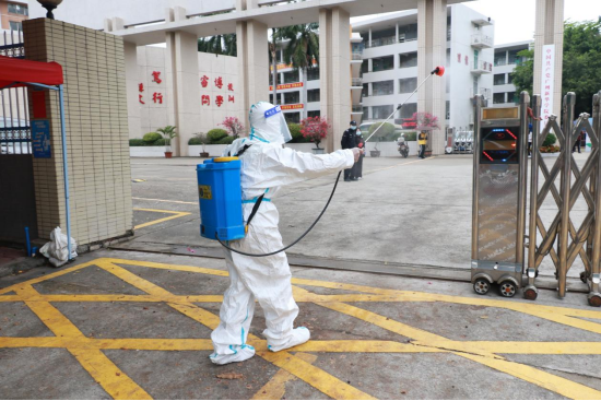 发热学生乘坐疫情防控转运车去属地定点医院发热门诊就诊后,工作人员对实验室场所进行消杀