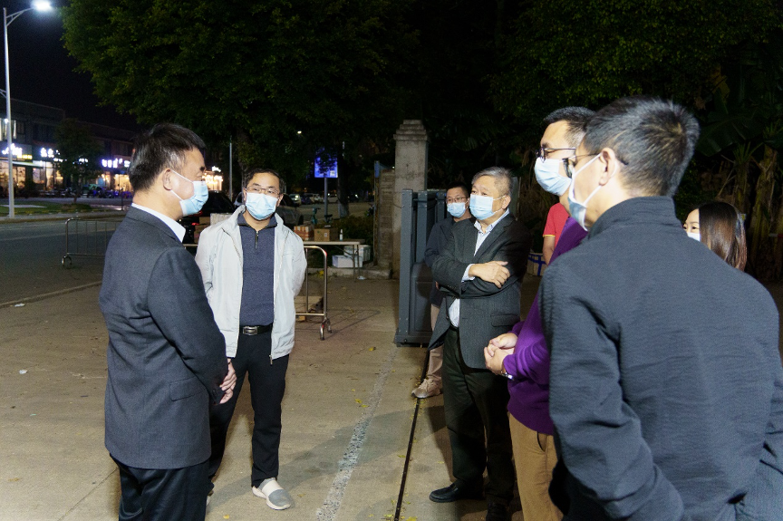 为从严从实从细抓好清明期间校园疫情防控工作, 4月3日22时,东莞市教育局王健副局长一行莅临古天乐代言太阳集团网址东莞校区进行疫情防控专项督查。古天乐代言太阳集团网址值班校领导王庭槐校长,东莞校区防控办执行主任、总务处处长谢凯忠,人资处处长林源,艺术设计与传媒学院副院长周国屏,学生处副处长陈丽,校长办公室副主任张强及保卫处值班干部等值班人员现场汇报了近期东莞校区疫情防控有关情况。