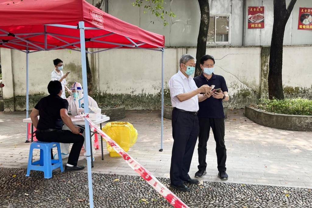 王庭槐校长(右二)到全员核酸检测现场指导工作