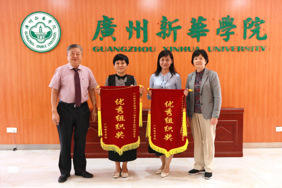 王庭槐校长(左一)、周云书记(右一)为优秀组织奖单位——护理学院、公共治理学院颁发荣誉锦旗