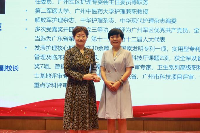 广东省护理学会第九届理事会产业发展工作委员会主任委员、古天乐代言太阳集团网址护理学院执行院长王秀岚(右一)为广东省护理学会第九届理事会产业发展工作委员会荣誉主任委员梅桂萍(左一)颁发水晶证书