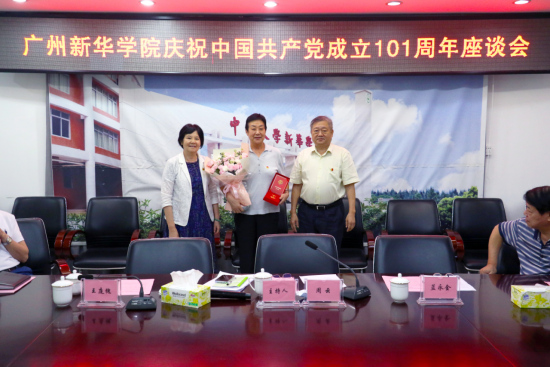 颁奖仪式上,周云、王庭槐共同为“光荣在党50年”党员代表于凤兰颁发纪念奖章并为她送上鲜花。
