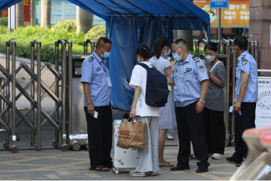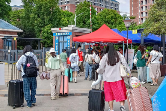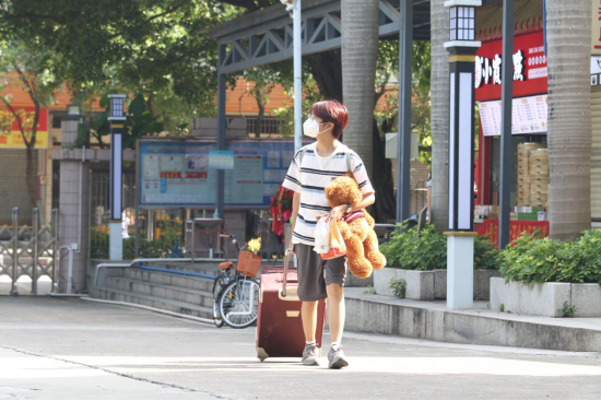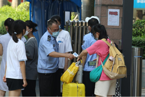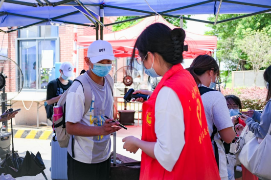 虽然近日穗莞两地持续高温,但志愿者们身着的“红马甲”,依然是校园里最靓丽的风景。