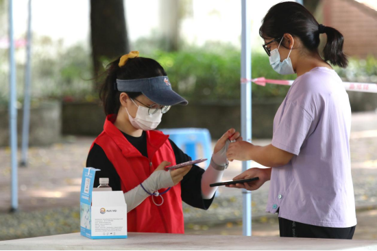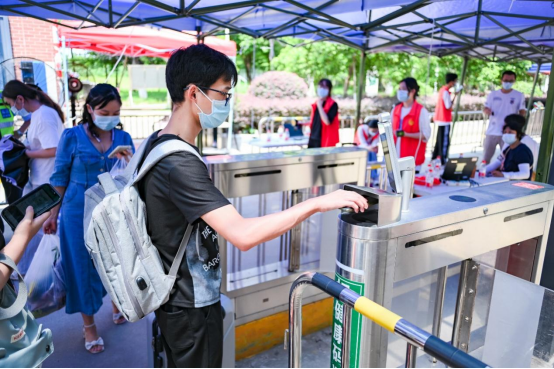 校门内,三十余个帐篷拼接搭建而成的“健康长廊”,是为同学们遮阳庇荫的暖心“第一站”。同学们扫描iXH健康码、检查粤康码和行程卡、测温、核酸检测等流程,均有学校的贴心“守护”。