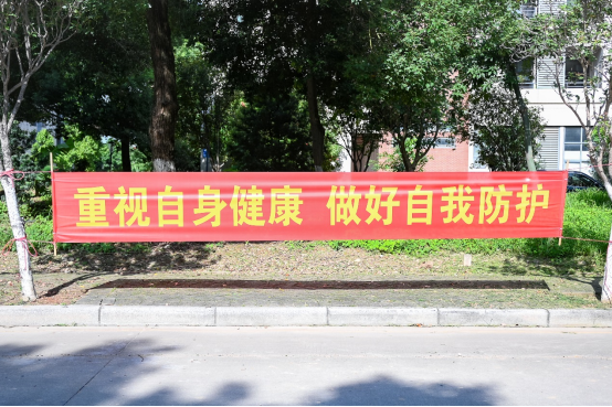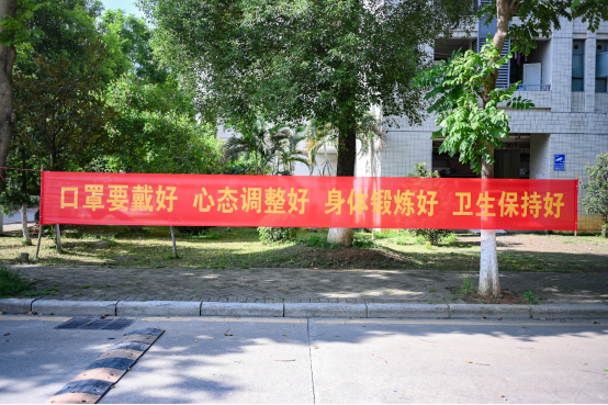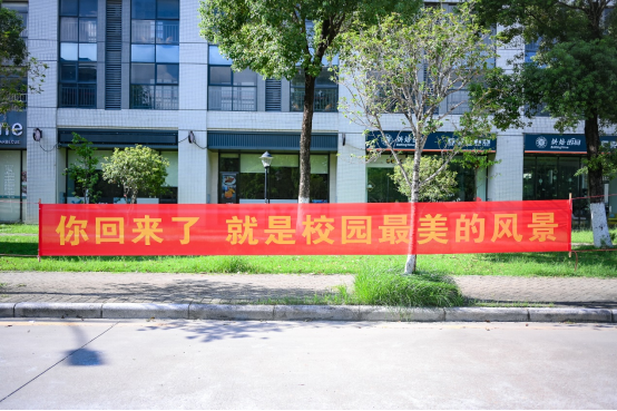 学校还在校门口、校道旁设置了暖心展板和横幅,欢迎同学们“回家”,叮嘱同学们做好防疫工作。