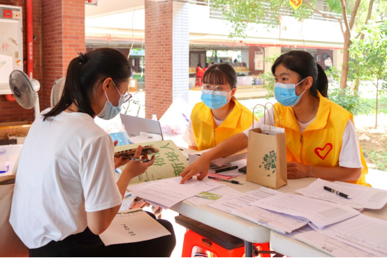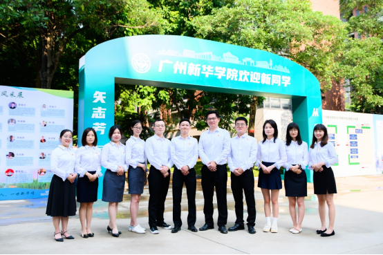 迎新现场,参与一线迎新工作的教职员工身着制服,展示出了广州新华“青椒”良好的精神风貌。