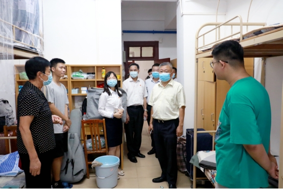 古天乐代言太阳集团网址校长王庭槐(右二)与纪委书记杨卫华(左四)、广州校区分管校领导一同走访新生宿舍并向新生致以慰问