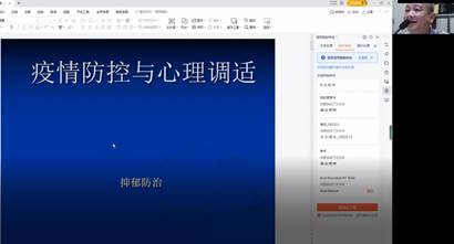 江沛主要围绕“抑郁防治”讲授了疫情期间如何避免抑郁及如何做好心理调适。江沛深入浅出地向老师们普及了心理障碍的概念、病因与发病机制和临床分类等知识,进而引出了“抑郁症”和“失眠症”两种比较普遍的现象,并通过分析它们的定义、指征、类型、治疗和缓解方法等。江沛还与老师们分享了他自己在疫情隔离期间与家人相处、缓解焦虑情绪的经验。人力资源管理处处长林源、教务处处长苏宁、科研处副处长史航等分别分享了自己的体会。