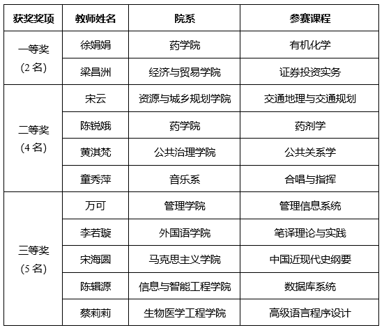 经过院系初赛、校赛网络评审、校赛现场决赛激烈的角逐,徐娟娟等11名教师荣获奖项,管理学院和药学院共2个单位荣获优秀组织奖。
