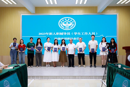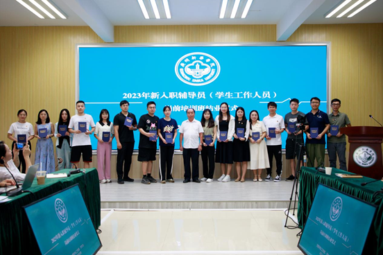 学校副校长蓝永金为新入职辅导员(学生工作人员)颁发结业证书