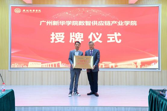在校企双方代表的见证下,王庭槐、王华平签署共建合作协议,并举行了数智供应链产业学院揭牌和授牌仪式。