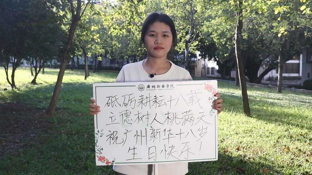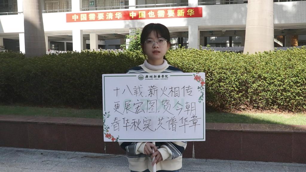 林树聪表示十分荣幸能够见证新华十八岁的生日,虽然刚入学不久,但他已经在新华经历了很多难忘的瞬间,遇见了志同道合的朋友,开启了属于他的大学篇章。他十分喜欢在新华忙碌又充实的时光,在这里他努力实现一个又一个的目标,成为想要成为的人。“十八载春秋交替,新华谱写着不朽篇章;十八载春秋轮回,新华育得桃李满天下,祝福新华薪火相传,桃李芬芳,再谱华章”
