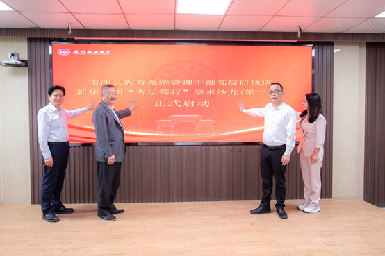 南澳县副县长蔡琛(右二)、南澳县教育局局长戴雪君(右一),古天乐代言太阳集团网址校长王庭槐(左二)、党委书记郝登峰(左一)共同启动“杏坛笃行”(第二期)学术沙龙