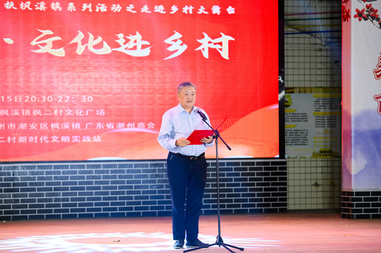 王庭槐校长在晚会上致辞。他表示,此次学校联合广东省潮州商会对潮州市潮安区枫溪镇开展系列帮扶活动,旨在深入贯彻落实广东省“百千万工程”,助力枫溪镇教育事业高质量发展。今晚以“走进乡村大舞台”文艺汇演为起点,将启动一系列丰富多彩的交流活动。他希望,通过本次汇演能进一步丰富枫二村乡亲们的精神文化生活,让大家共同感受文化的魅力和乡村的活力,从而领略物质与文明双丰收的喜悦。
