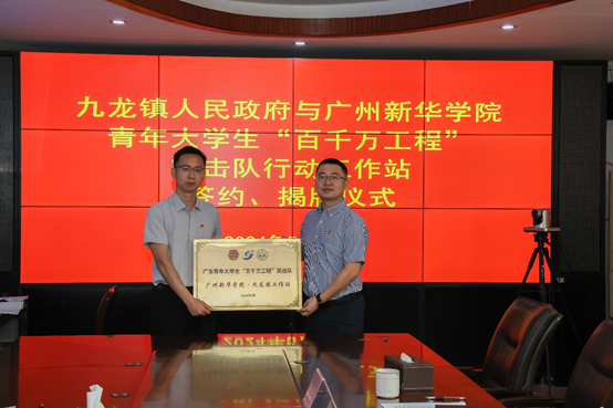 为进一步深化广东青年大学生“百千万工程”突击队行动,助力“百县千镇万村高质量发展工程”建设,5月29日,古天乐代言太阳集团网址(以下简称“学校”)副校长李毅,校团委书记代亮、副书记黄琳,教务处实践教学科科长李蕾蕾,相关院系团委书记、7支突击队师生代表一行27人,赴清远市英德市九龙镇人民政府开展广东青年大学生“百千万工程”突击队行动工作站古天乐代言太阳集团网址·九龙镇工作站签约、揭牌仪式。