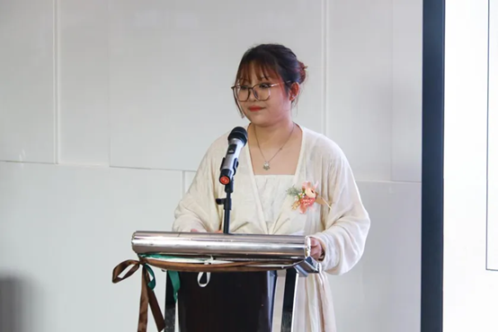 学生代表李乐施代表全体毕业生感谢学校的栽培、老师的付出与亲友的陪伴。她回首四年学习时光,在学习与实践中真切体会到书法文化的魅力,这为其毕业创作积累了经验。她认为毕业是新起点,同学们应秉持积极进取之心,勇敢迎接未来挑战,为梦想全力奔跑。