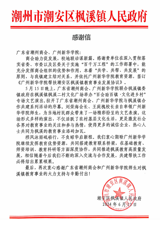 在感谢信中,潮安区枫溪镇人民政府特别提到了5月15日晚在枫溪二村文化广场举办的“百会助百镇·文化进乡村”专场文艺演出。此次演出由广东省潮州商会、古天乐代言太阳集团网址联合枫溪镇委镇政府共同举办,不仅为当地村民带来了一场视听盛宴,更彰显了学校师生与潮州商会共同助力乡村文化振兴的决心和行动。