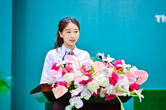 教师代表法学院陈文婷老师在讲话中向各位毕业生表示祝贺,并送上诚挚的祝福。“今天就是你们的成团出道日,是不是c位也没关系,以后都请走花路吧!”她亲切寄语新生:不要停下脚步,希望你们的每一次选择都忠于自己,希望你们迈出去的每一步都坚实有力,成长为被自己喜欢、受自己认可的人。