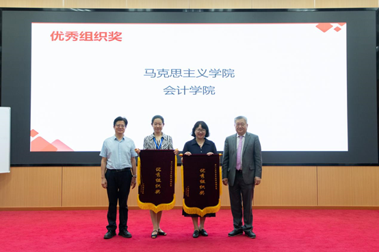 王庭槐校长(右一)和郝登峰书记(左一)为马克思主义学院、会计学院颁发“优秀组织奖单位”荣誉锦旗